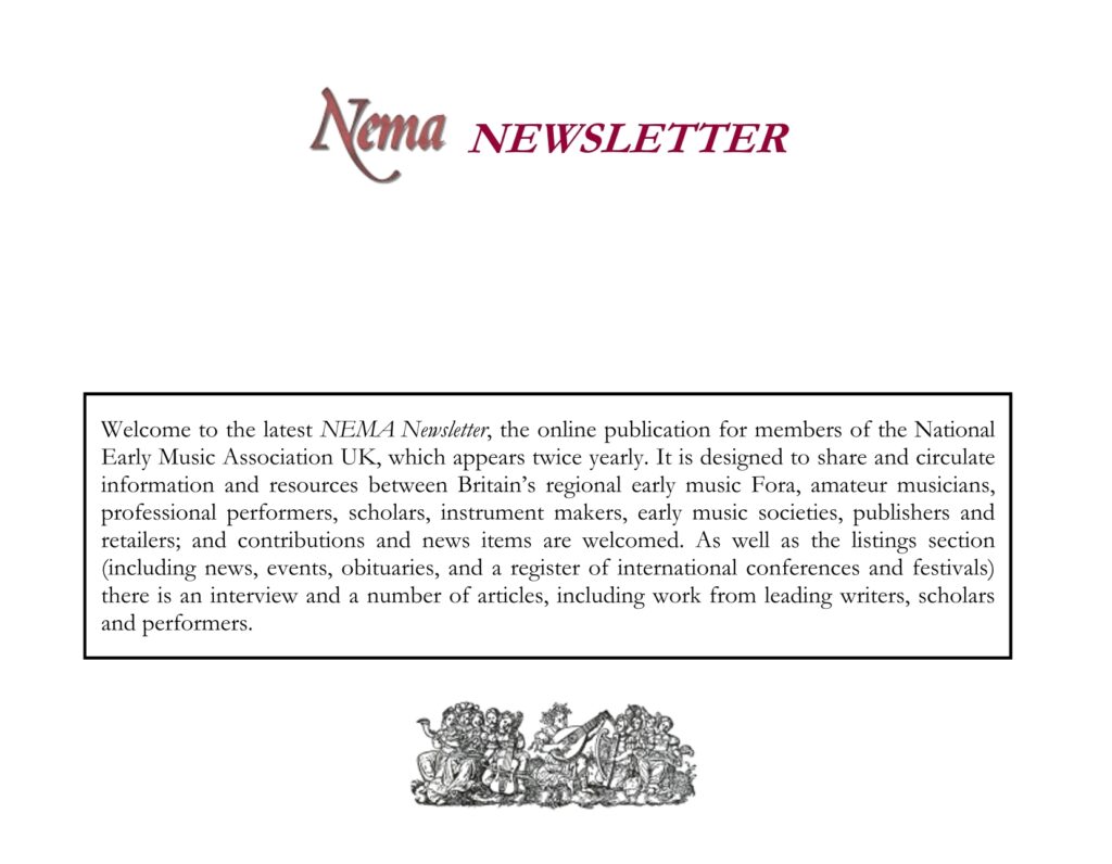 We currently produce two publications: Early Music Performance & Research (successor to Early Music Performer) and the biannual NEMA Newsletter. If you are interested in contributing to these, please see our submission guidelines.